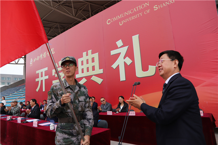 院长王建国发表了热情洋溢的讲话,他首先代表学校对承训部队官兵表示诚心的问候和感谢,对来自全国各地的同学们表示热烈欢迎。他讲到,今年是学校建校35周年暨转制升本5周年。35年来,学校实现了三次办学层次的历史性飞跃,成为了一所特色鲜明、充满活力、享誉业内、前景宽广的行业大学,各项事业不断开创出崭新局面,希望全体新生与母校一起携手努力,为将我校建成特色鲜明行业一流的传媒类院校共同奋斗。他就全体新生如何开始大学生活提出四点建议:一是要乐于管理时间,勤于思考学习。要尽早规划自己的学习生涯,勤奋自律、合理安排。要在大学珍贵的时光里,遵循学习的规律,掌握学习的方法,提升学习的能力,收获学习的乐趣;二是要善于掌握情绪,善于理性面对。要树立正确的世界观、价值观和人生观,要善于做情绪的调节师、心情的美容师,勇于接纳自己和生活中的不完美,不钻牛角尖,不走死胡同,学会自我克制和理性表达;三是要勇于大胆尝试,敢于开拓创新。希望同学们抓住机遇、勇于尝试,勤于实践、学以致用,积极走出第一课堂,多动手、多体验,多思考、多分享,尽早形成独立之精神、自由之思想,让灵感来源和思想火花汇聚成真正的核心竞争力,成就卓越人生。四是要善于培育情怀,善养浩然之气。作为山传学子,要孕育家国为先、昂扬自信、坚韧刚毅的博大情怀,弘扬优良传统,担负起时代责任和家国使命,要自信地绽放青春,自信地迎接挑战,将来自信地引领未来,快乐地追求人生理想。同时,希望同学们涵养正气、静气和雅气,以成浩然之气。