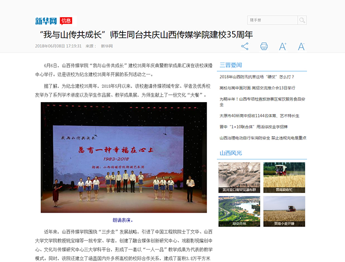 近日,新华网、人民网对我校建校35周年庆典暨教学成果汇演进行了宣传报道。6月6日,为庆祝建校35周年,我校举办了建校35周年庆典暨教学成果汇演。近年来,我校在人才引进、平台建设、实践教学、国际交流、内涵建设等方面取得了一系列成果,这既是对学校过去发展的肯定也是推动学校在新时代、新征程中砥砺奋进的动力。