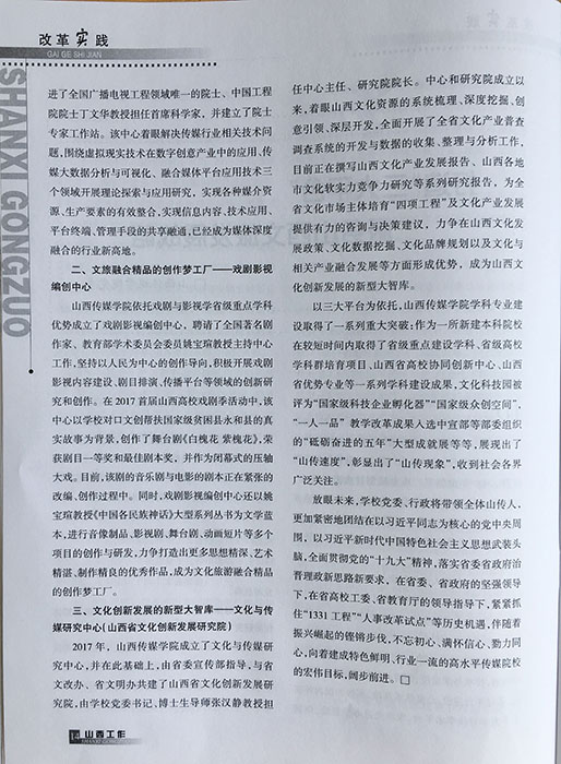 近年来,学校深入学习贯彻习近平新时代中国特色社会主义思想和十九大精神,贯彻“1234567”的办学思路和治校理念,紧紧围绕“三步走”战略目标,牢牢抓住国家“双一流建设”、山西省“1331工程”、应用型高校转型试点等难得机遇,找准办学定位、厘清办学思路、创新办学模式,通过平台建设,凸显学术高峰,积极和国内外高水平大学对接学术平台,吸收先进办学经验,创新教学、科研、创作模式,提前完成了学科建设等一系列突破,努力构建出现代的、完整的、科学的大学模式,实现了超常规、跨越式的发展。在这一进程中,学校系统思考新时代支撑服务山西“三大目标”的科学路径,主动对接我省文化旅游战略性支柱产业的发展需求,打造了融合媒体创新研究中心、戏剧影视编创中心、山西省文化创新发展研究院三大平台。这三大平台已成为学校学科建设的三个高地、对外的三个窗口,对内与学科链对接、对外与行业和山西发展产业链对接,主动服务山西省文旅融合发展战略。
