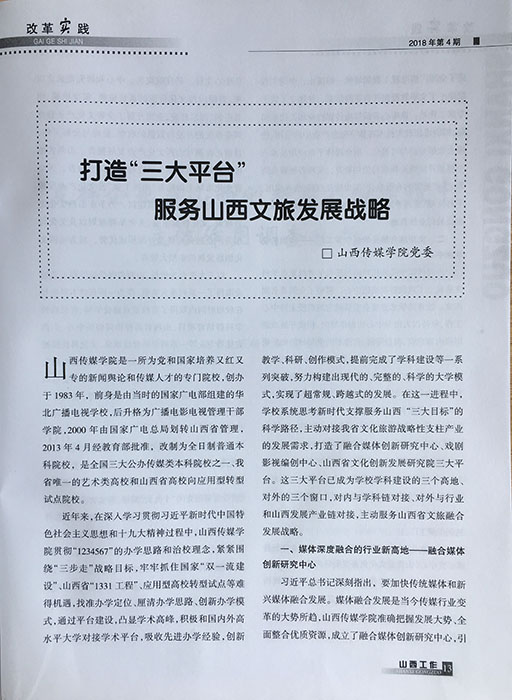 近日,由省委主办的《山西工作》(2018年第4期)刊载了署名我校党委的文章,题为《打造“三大平台” 服务山西文旅发展战略》。